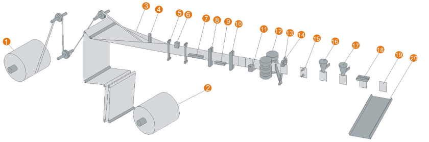 1.放拉鏈機構 2. 放膜機構 3.包裝膜成型 4. 拉鏈導向 5. 包裝膜導向 6. 色標檢測 7. 上封拉鏈 8. 豎封拉鏈機構I 9. 底封機構 10. 豎封機構 11.易撕口裝置 12. 伺服牽袋 13. 剪切機構 14. 夾袋 15 開袋機構 16. 充填I 17. 充填II 18. 上封 19.. 成品 20. 成品輸出
