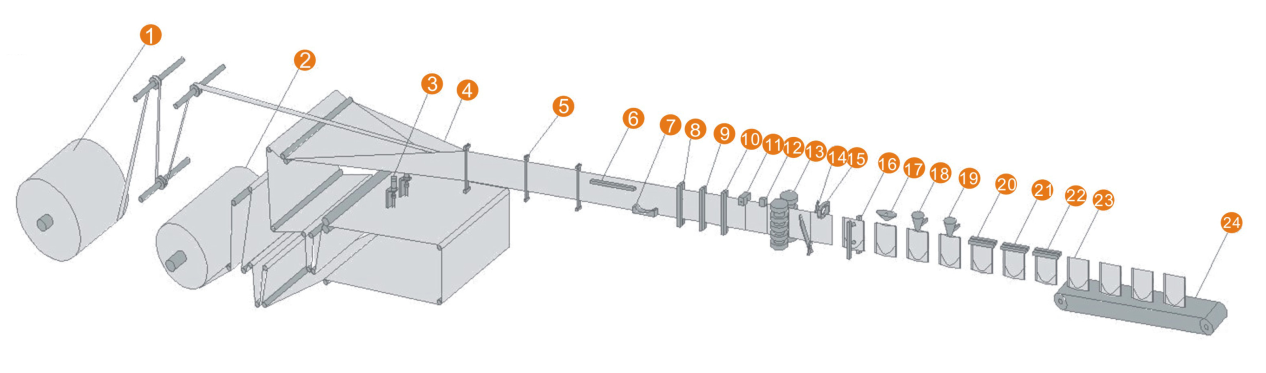 1.放拉鏈機構 2. 放膜機構 3. 底部沖孔 4.包裝膜成型 5. 包裝膜導向 6. 上封拉鏈 7. 底封機構 8. 豎封拉鏈機構 9. 豎封機構I 10. 豎封機構II 11.易撕口裝置 12.色標檢測 13. 伺服牽袋 14. 剪切機構 15. 夾袋 16. 開袋機構 17. 吹氣裝置 18. 充填I 19. 充填II 20. 展袋 21. 上封I 22. 上封II 23. 成品 24. 成品輸出