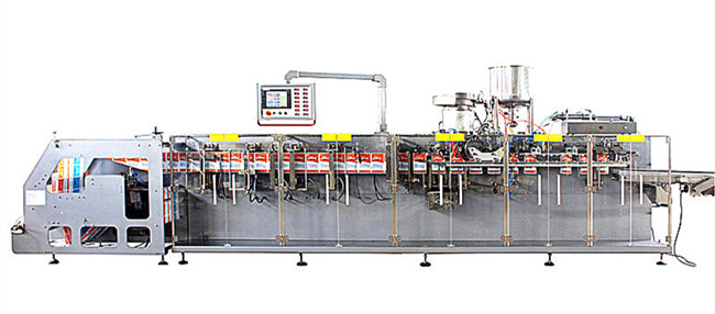 1. 放膜機構 2. 底部沖孔 3.包裝膜成型 4. 包裝膜導向 5. 底封機構 6. 豎封機構I 7. 豎封機構II 8.色標檢測 9. 伺服牽袋 10. 剪切機構 11. 夾袋I 12. 夾袋II 13. 斜切機構 14. 第一開袋 15. 振動裝置 16. 加嘴裝置 17. 封嘴裝置 18. 第二開袋19. 吹氣裝置 20. 充填I 21. 充填II 22. 展袋 23. 上封I 24. 上封II 25. 成品 26. 成品輸出