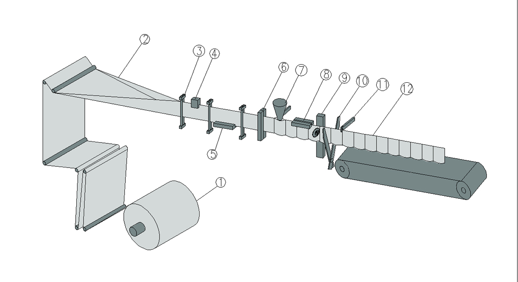 1. 放膜機構 2.包裝膜成型 3. 包裝膜導向 4. 色標檢測5. 底封機構 6. 豎封機構 7. 充填 8. 上封 9.滾刀虛刀裝置 10. 剪切機構 11. 牽袋機構 12. 成品輸出