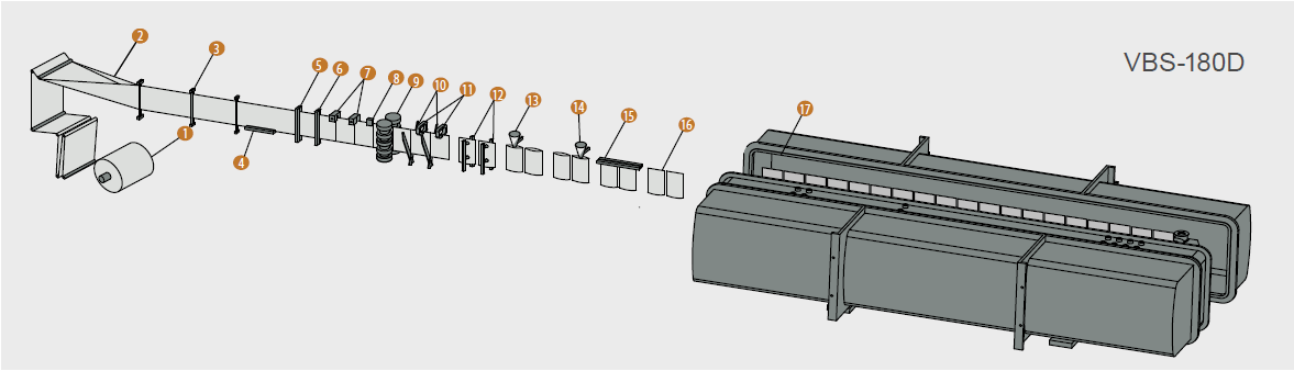 1. 放膜機構 2.包裝膜成型 3 包裝膜導向 4. 底封機構 5. 豎封機構I 6. 豎封機構II 7.易撕口裝置 8.色標檢測 9. 伺服牽袋 10. 雙剪切機構 11. 雙夾袋機構 12. 雙開袋機構 13. 充填I 14. 充填II 15. 上封機構 16. 接袋 17. 抽真空