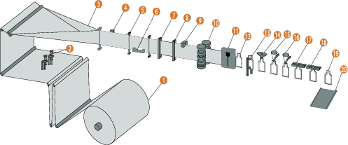 1. 放膜機(jī)構(gòu) 2. 底部沖孔 3.包裝膜成型 4. 色標(biāo)檢測(cè) 5. 包裝膜導(dǎo)向 6. 底封機(jī)構(gòu) 7. 豎封機(jī)構(gòu)I 8.豎封機(jī)構(gòu)II 9. 易撕口裝置 10. 伺服牽袋 11. 剪切機(jī)構(gòu) 12. 夾袋I 13. 開袋機(jī)構(gòu) 14. 吹起裝置 15. 充填I(lǐng) 16. 充填I(lǐng)I 17. 上封裝置 18. 上封裝置 19. 成品 20. 成品輸出