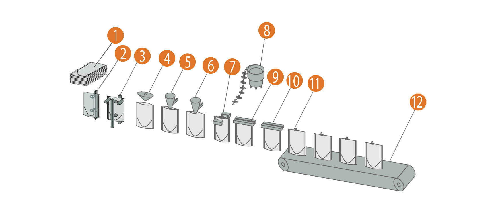 1.預制袋疊放 2. 翻轉取袋機構 3. 開袋機構 4. 吹氣機構 5. 一次灌裝 6 二次灌裝 7. 加嘴裝置 8. 振動裝置 9 上封 I 10. 上封 II 11. 成品 12. 伺服托袋輸出